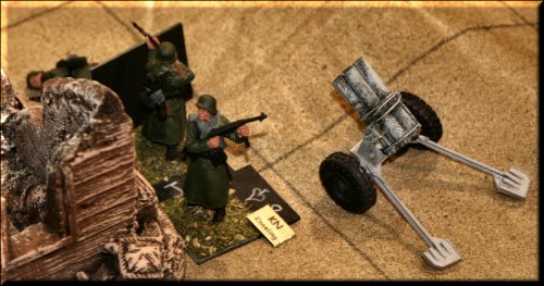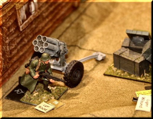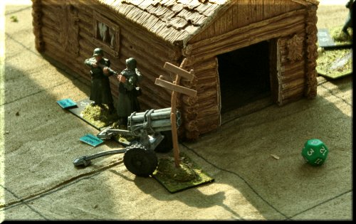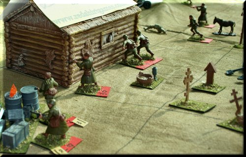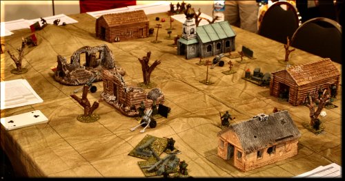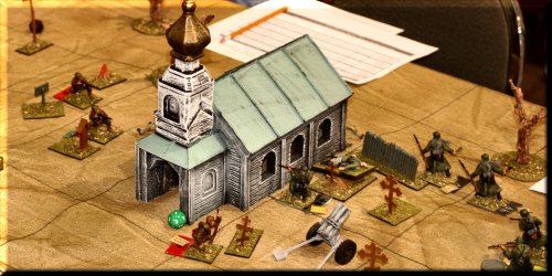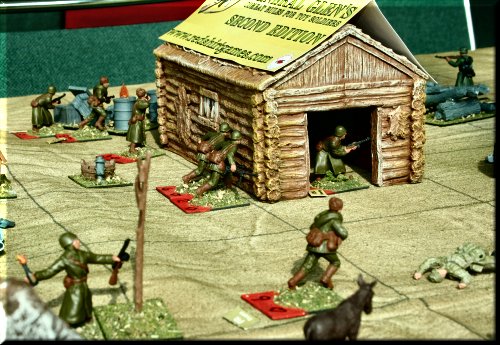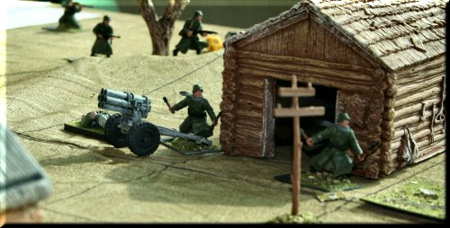 General Glen's World War II Skirmish took us to the Russian Steppe this year, where Germans and Russians fought it out over a village full of Nebelwerfer rocket launchers. The miniatures and terrain all came in a playset sold by Toy Soldiers of San Diego called The Road To Stalingrad. You get everything you see in the pics, minus 2 buildings and all of the trees, for a couple hundred dollars. The figs don't come painted, but I only used about half in this scenario. The buildings are made of injected foam and are painted. The rules we used were General Glen's Combat Rules for Toy Soldiers (Second Edition), for sale in our Store. Next year... vehicles. Lots of vehicles. |