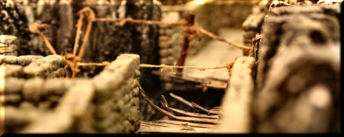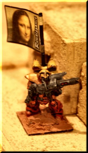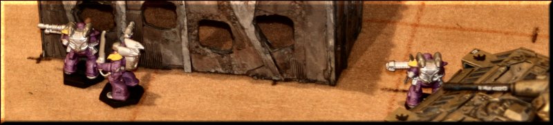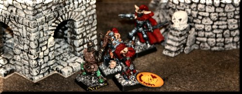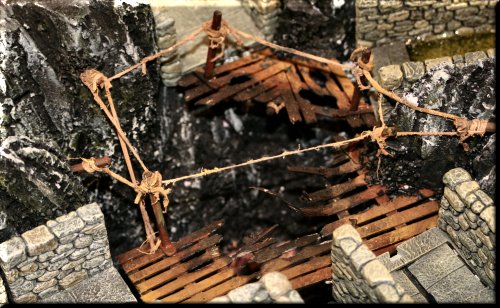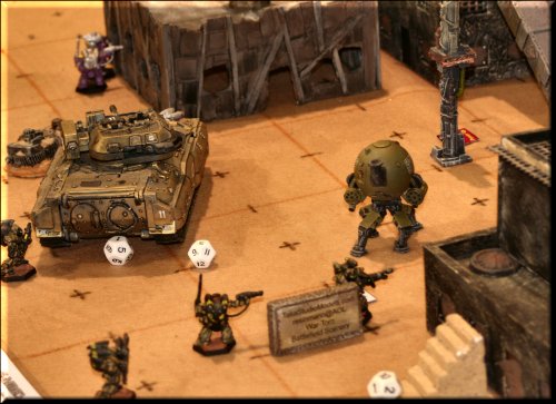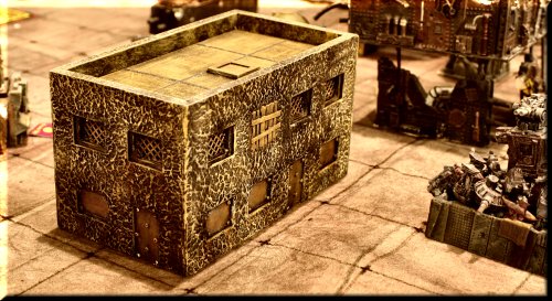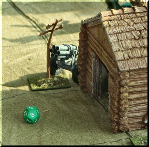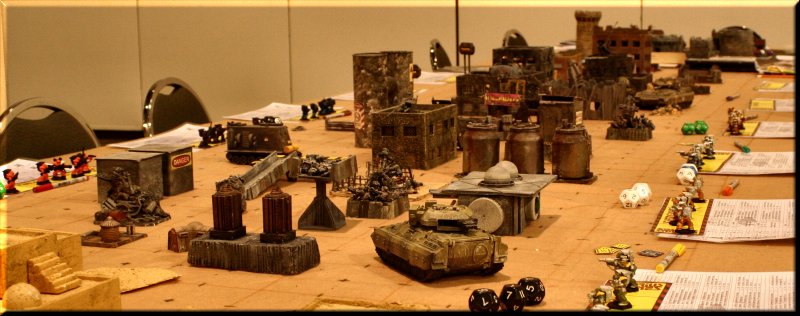 Our terrain is an eclectic mix of home-made, resin kits, plaster terrain and just plain junk. We think it looks pretty good. Plays well too! |