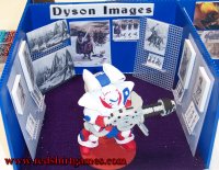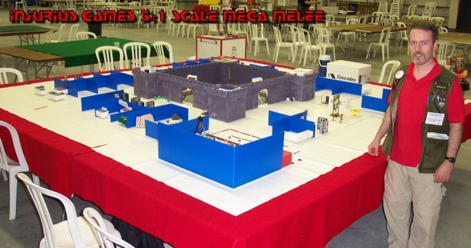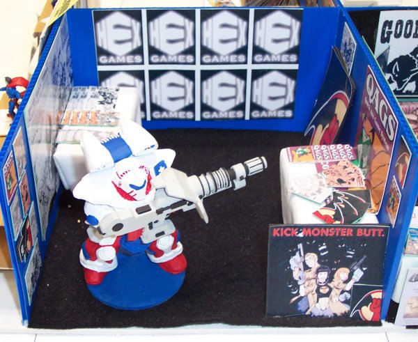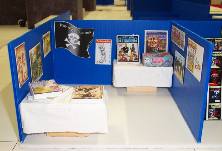 The game surface duplicates, with some fabrication on our part, the dealer's area at Origins and Gen Con. We're using the biggest miniatures we've ever used, 3:1 scale Injurius Games Gladiators from our Injurius Games line. Each booth is hyper-detailed and is as realistic as possibe. In 1:18th scale, a ten foot booth is reduced to nine inches in width. We have sent out a call to the companies who have booths at Origins and Gen Con: give us permission, and we'll duplicate your booth to the best of our ability. Check out the photos below of only some of the booths that will be featured in our runnings of this massive event in Columbus and Indy. If you want us to use your likeness in our game, let us know! There is no cost, no obligation, nothing. Just lots of cool booths in our big game. Click here to download a PDF document you can fill out and fax to us (or fill out and email to us if you have PDF Writer or Distiller). |