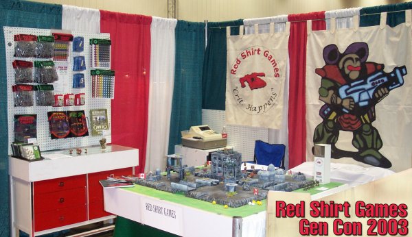 Here is a photo of the booth we built at Gen Con. Is it me, or are the backdrop colors designed to discourage their use? |