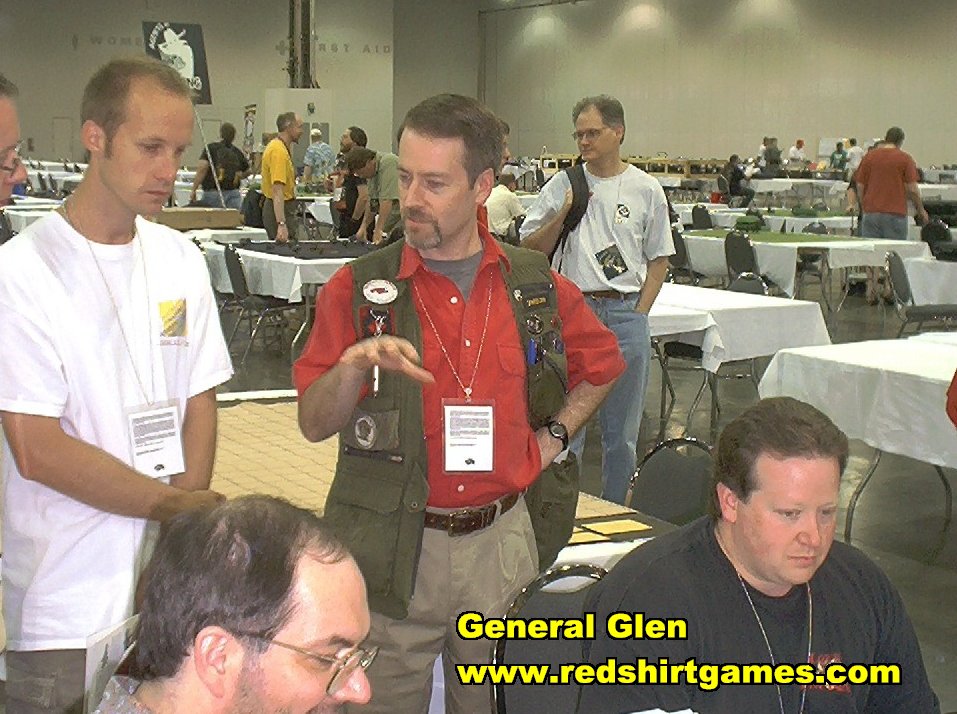 The final, and favorite Booth Babe is, of course, "General" Glen Simpson from Red Shirt Games. He was not supposed to grace us with his presence at this con, but he wheedled a deal with is wife and managed to become a camper for part of the con. Glen ended up playing Run Out The Guns for most of the cons, and hung out with his pirate friends in our room when he wasn't walking the plank. |