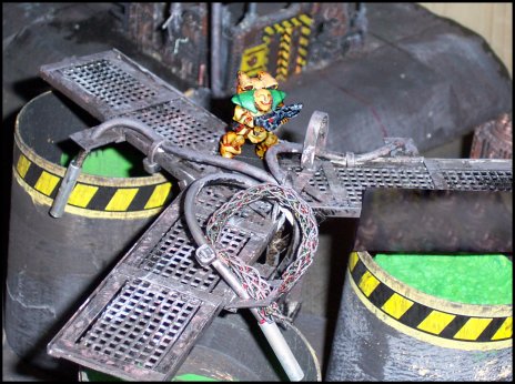 land on top of a ruined ore silo, not far from the trashed ore extractor.